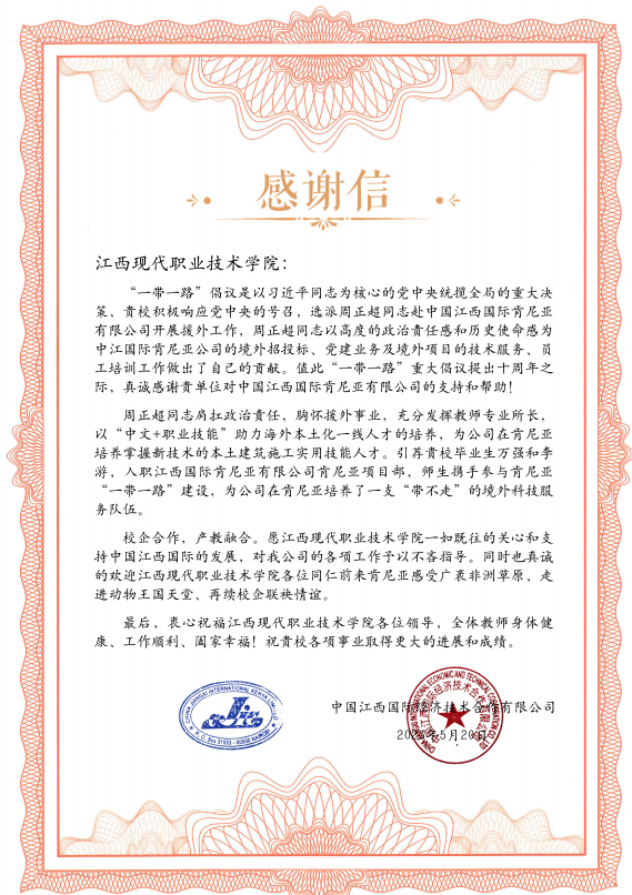 他还与在肯毕业生组成境外技术服务团,持续为海外项目提供技术支持。中江国际肯尼亚公司在给学院的感谢信中写道:“周老师带领的团队为我们培养了一支‘带不走’的技术力量,他们的专业精神和敬业态度令人敬佩。”